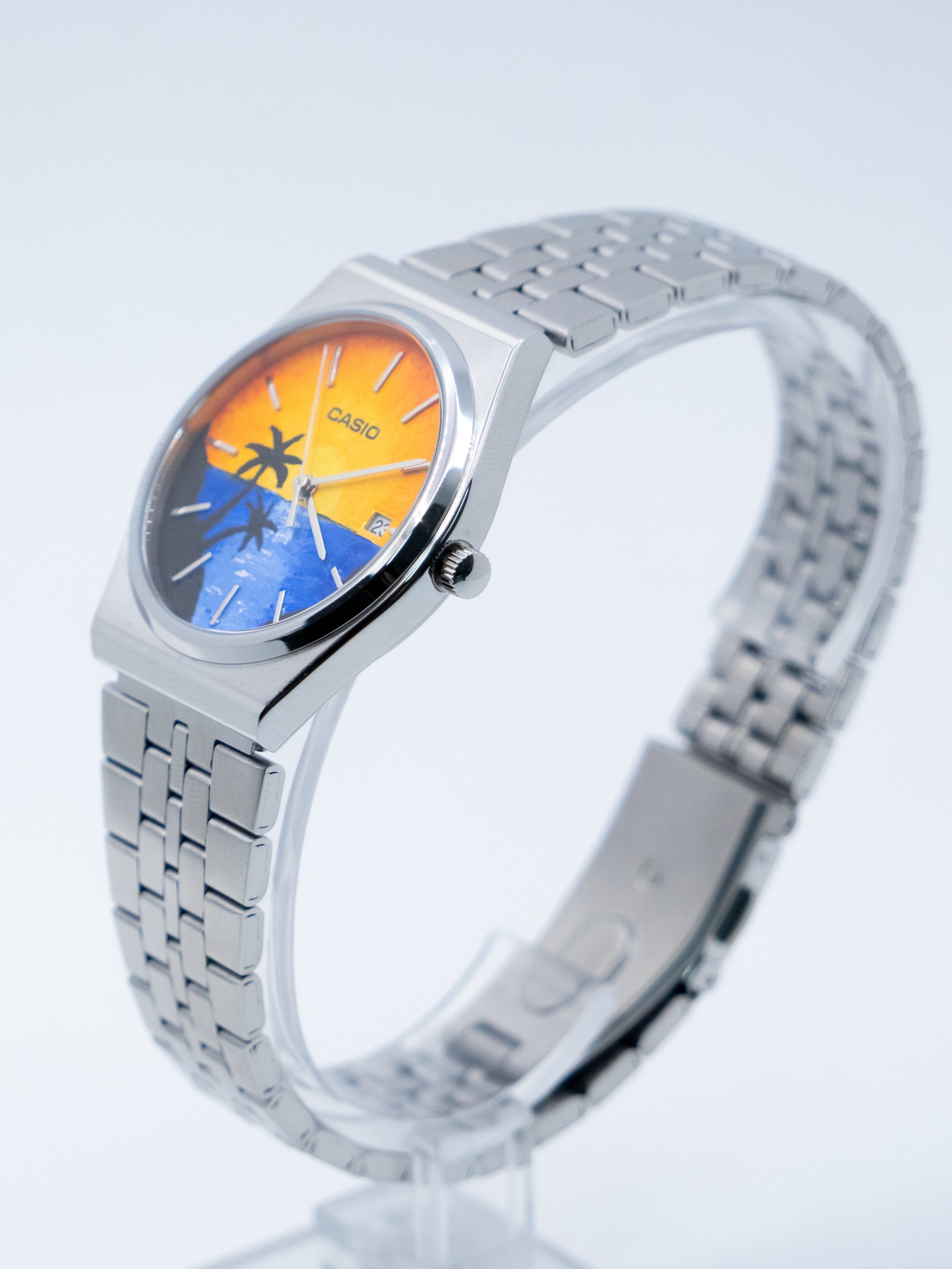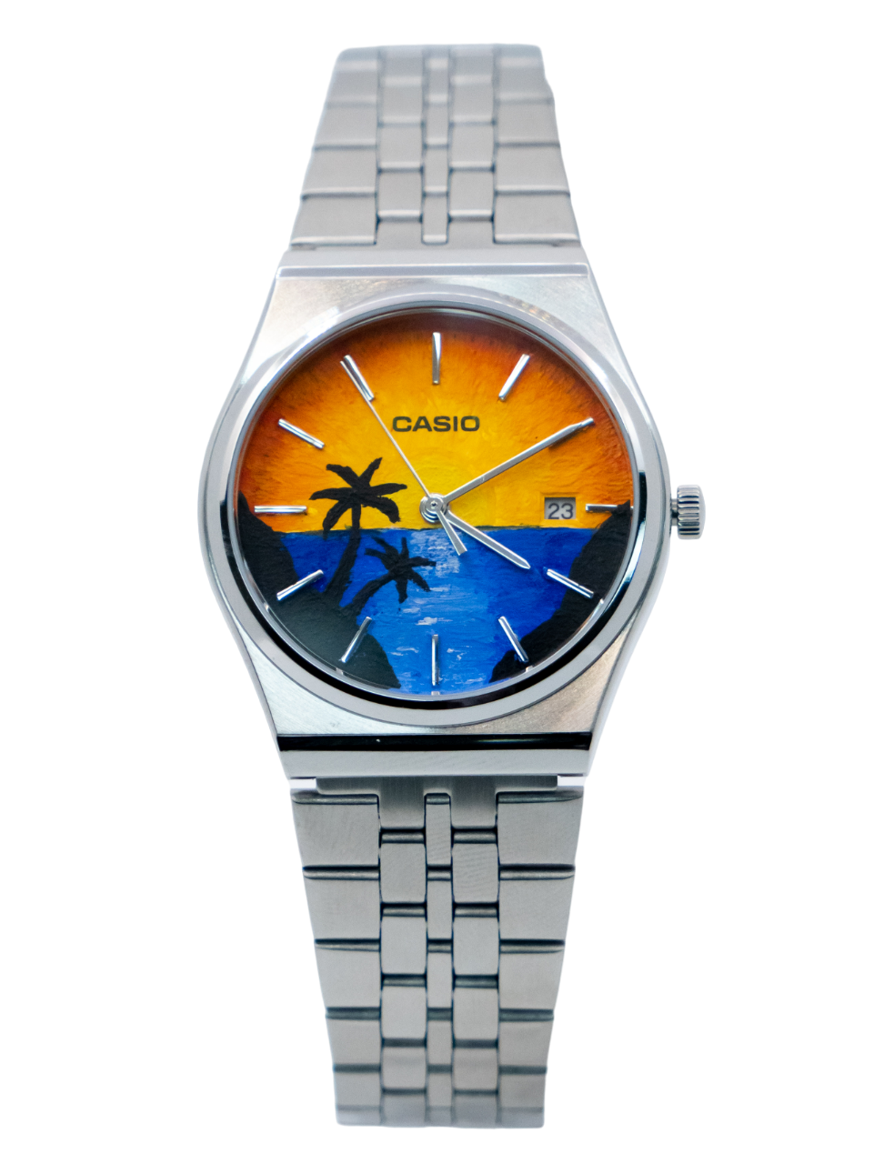 Imagine a watch that captures the essence of a perfect sunset at the beach. The hand-painted dial features a vibrant sunset landscape, where warm shades of orange and gold blend seamlessly, evoking the magic of twilight. The waves of the sea are delicately represented in a deep blue with white highlights that reflect the light of the sun setting on the horizon, creating an almost hypnotic effect.