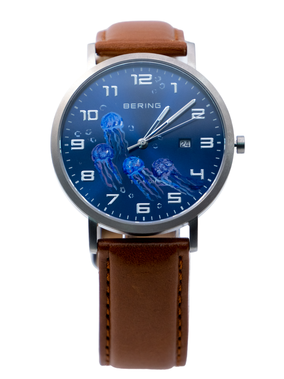 Este deslumbrante reloj pintado a mano presenta un cautivador diseño de medusas. La esfera del reloj está adornada con varias medusas, sus tentáculos alargados y ondulantes extendiéndose en un elegante baile acuático. Las medusas, crean un contraste fascinante y armonioso contra el fondo oscuro y profundo de la esfera.